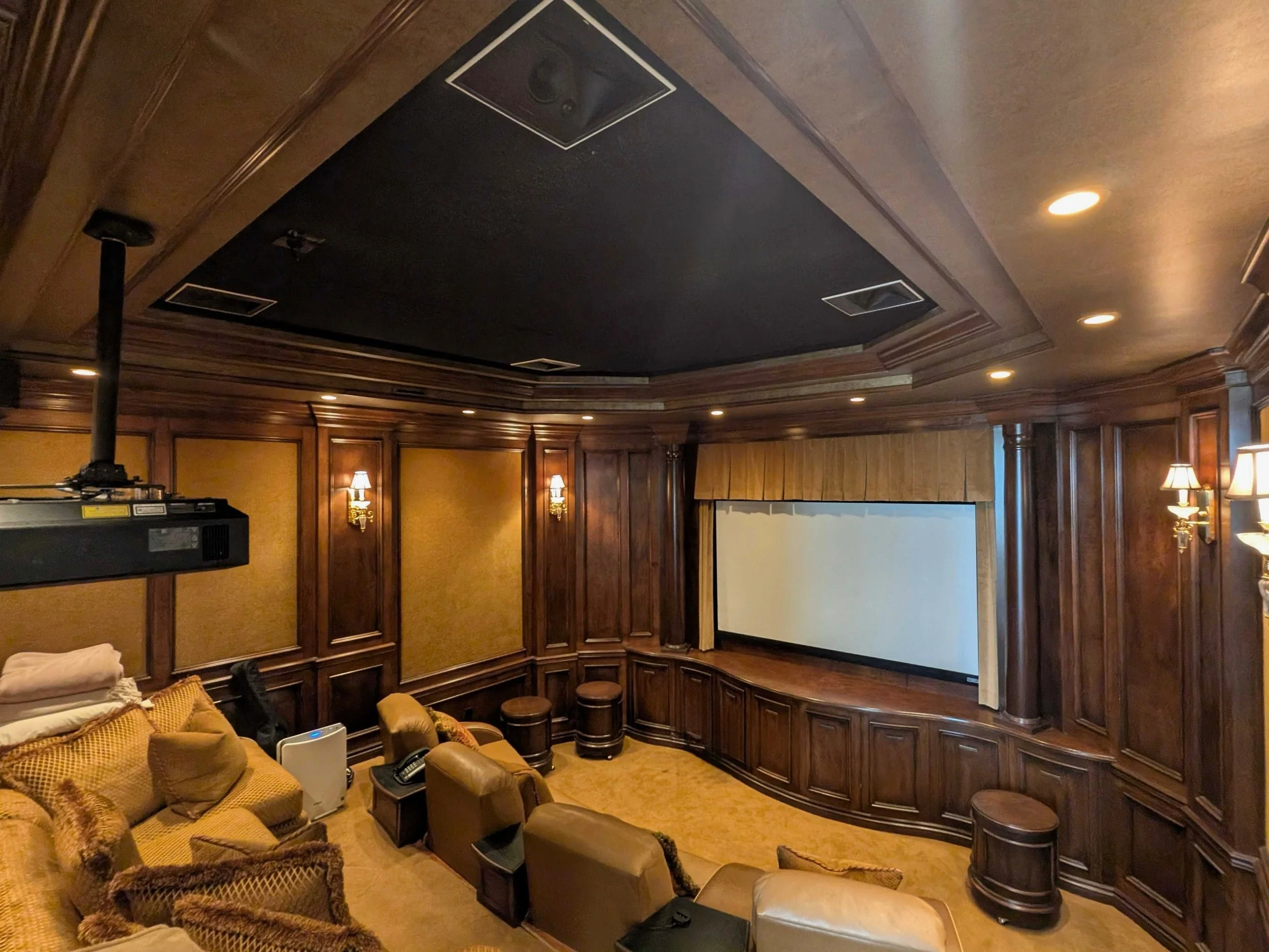 Full custom home theater featuring surround sound, projector system, acoustic design, and integrated lighting for a true cinematic experience.