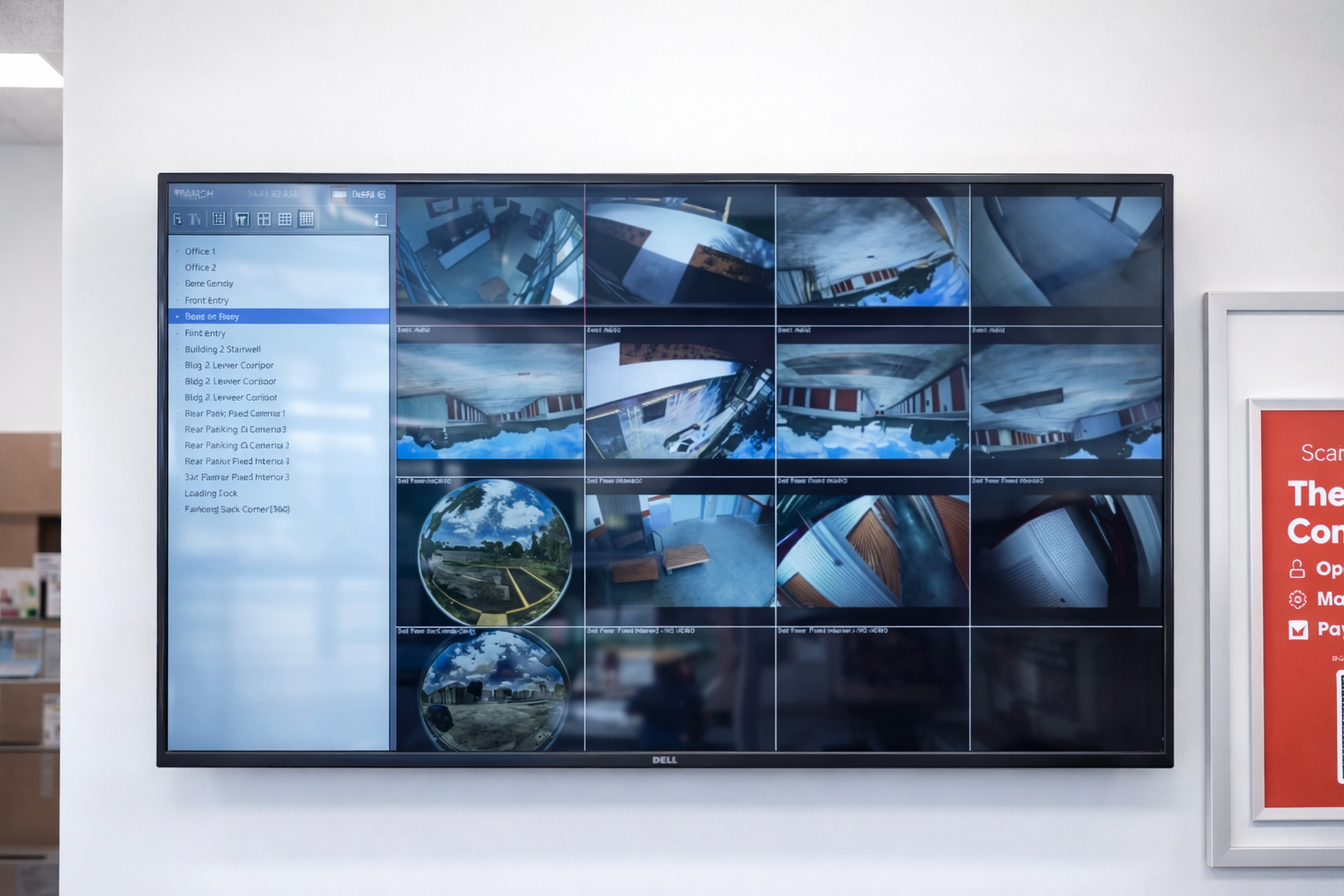 Wall-mounted monitoring display providing real-time access to multiple camera feeds for staff and management.