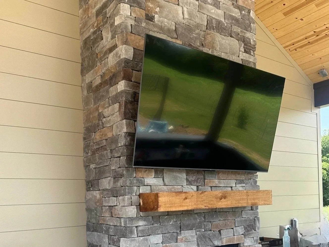 Custom outdoor TV installation seamlessly integrated above a stone fireplace for weather-ready entertainment and a clean finish.