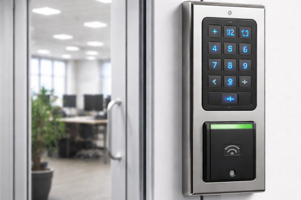 Installed a secure keyless entry system with keypad and RFID access for controlled, modern commercial entry.