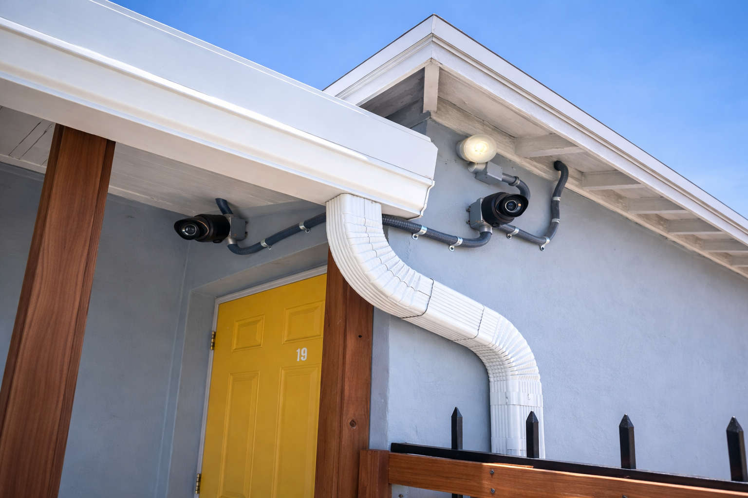 Installed exterior security cameras with clean conduit runs for reliable monitoring and property-wide coverage.