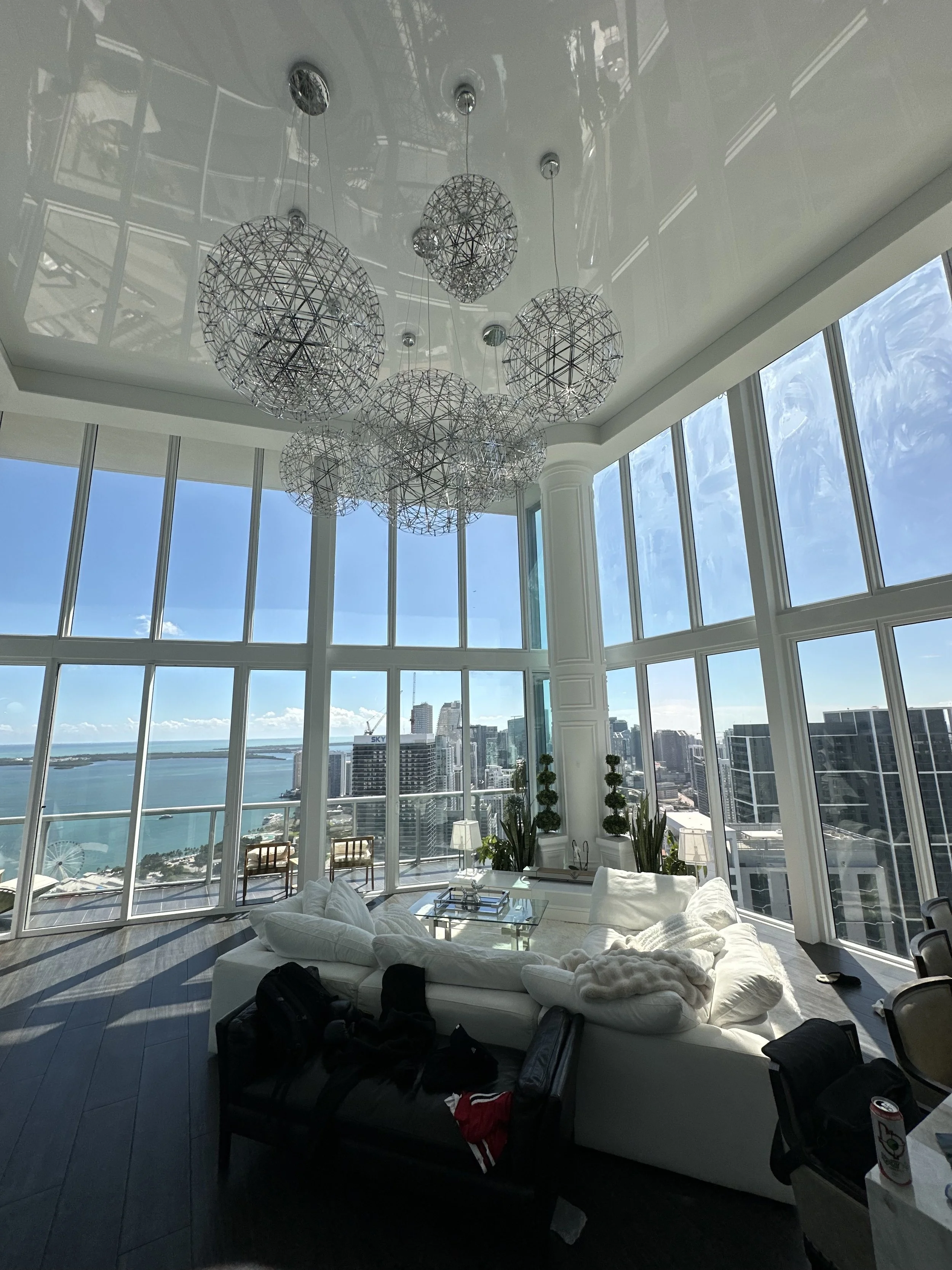 Installed motorized roller shades for effortless light control, privacy, and a sleek modern look with oceanfront views.